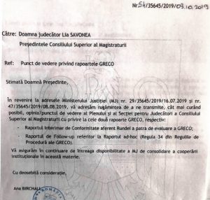 „Legat de multele întrebări pe care le-am primit zilele acestea privind analiza noastră pe GRECO și MCV, vă pot spune că așa cum am comunicat, de altfel, noi am așteptat un punct de vedere de la CSM, dar se pare că CSM era preocupat să modifice legea ANI, uzurpând, de altfel, atribuțiile Ministerului Justiției și trimițând direct la comisia din Senat, Am solicitat public și în scris aceste clarificări (…) este de datoria mea în calitate de ministru al Justiției să apăr atribuțiile și reputația Ministerului Justiției. Revin și cu această solicitare publică către CSM. Am făcut o revenire și săptămâna trecută să ne transmită în regim de urgență punctul de vedere al CSM cu privire la această analiză. Daca nu, o să dau publicității analiza pe care, repet, am întocmit-o pe baza punctelor de vedere primite de la instituțiile care ne-au transmis și toate asociațiile profesionale”, a declarat ministrul Ana Birchall.