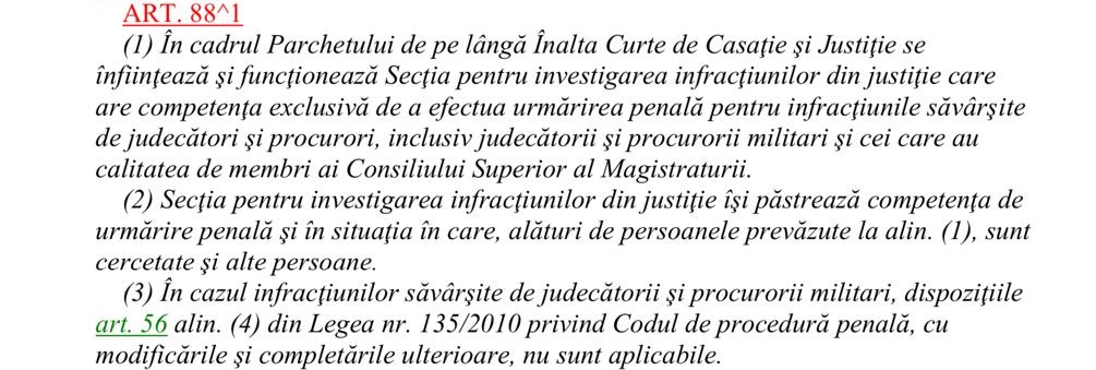 Ministrul Justiţiei Ana Birchall a criticat, miercuri, competenţele Secţiei pentru Investigarea Infracţiunilor din Justiţie (SIIJ), care spune că procurorii acestei Secţii pot investiga practic orice persoană numai pentru simplul motiv că este făcută o plângere pe numele lor şi a unui magistrat. Această competență lărgită este dată de articolul 88 indice 1 din legea 204/2004 privind organizarea judiciară, lege modificată anul trecut în Parlament de PSD-ALDE.