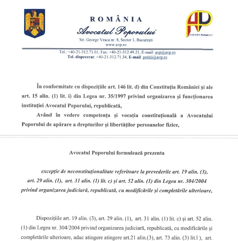 Concret, Avocatul Poporului a sesizat CCR cu privire la mai multe articole din Legea nr. 304/2004 privind organizarea judiciara. Este vorba de articolele 19 alin. (3), art. 29 alin. (1), art. 31 alin. (1) lit. c) si art. 52 alin. (1).