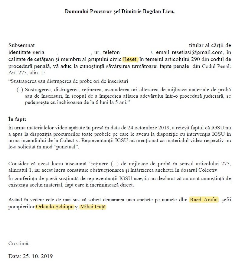 În urma dezvăluirilor de ieri în care am aflat cu stupoare că șefii IGSU a tăinuit probe video importante cu primele minute ale intervenției în cazul Colectiv, grupul civic Reset a formulat un denunț împotriva conducerii IGSU: