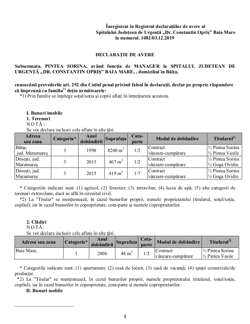 În documentul semnat la 3 decembrie 2019 și care a fost publicat pe site-ul Spitalului Județean de Urgență ”Dr. Constantin Opriș” din Baia Mare, unde Sorina Pintea a revenit în calitate de manager al instituției medicale, sunt menționate terenuri intravilane în suprafață de aproape un hectar, un apartament, dar și datorii de 150.000 de euro.