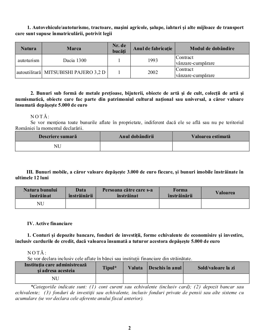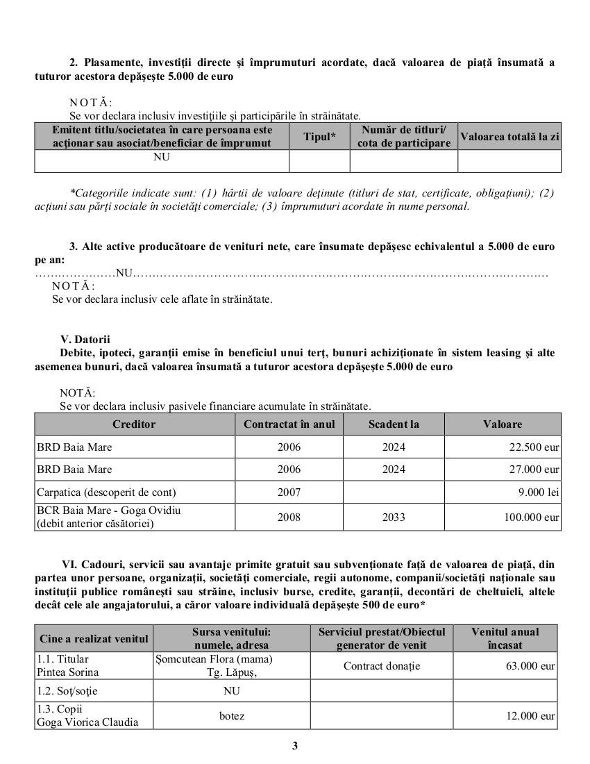 - Două credite contractate în 2006 de la BRD Baia Mare, în valoare de 22.500 euro, respectiv, 27.000 euro, scadente în 2024.