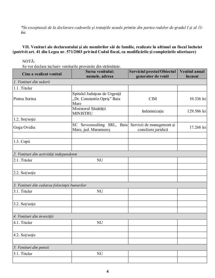 În declarația de avere semnată în 8 februarie 2018, Sorina Pintea menționează că a încasat 172.159 de lei de la Spitalul Județean de Urgență ”Dr. Constantin Opriș” din Baia Mare.