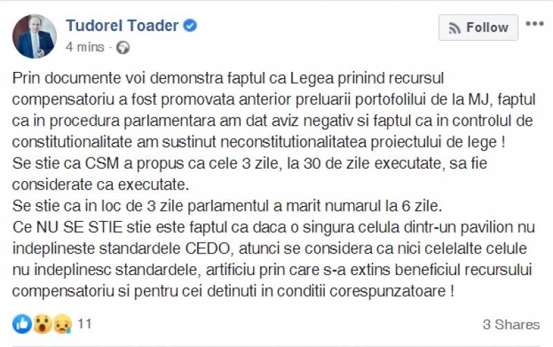 „Se știe că CSM a propus că cele 3 zile, la 30 de zile executate, să fie considerate ca executate. Se știe că în loc de 3 zile, Parlamentul a mărit numărul la 6 zile. Ce NU SE ȘTIE știe este faptul că dacă o singură celulă dintr-un pavilion nu îndeplinește standardele CEDO, atunci se consideră că nici celelalte celule nu îndeplinesc standardele, artificiu prin care s-a extins beneficiul recursului compensatoriu și pentru cei deținuți în condiții corespunzătoare!”, a scris Tudorel Toader.