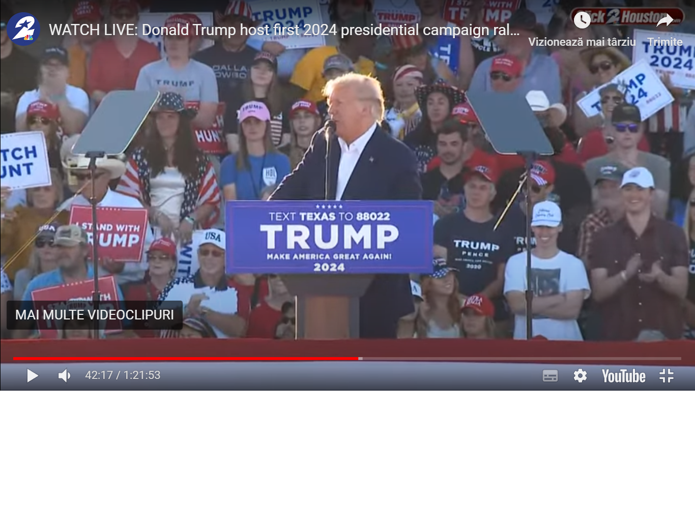 VIDEO Donald Trump in Texas: Prioritatile cele mai importante in cazul in care vor fi reales presedinte in 2024 le reprezinta oprirea razboiului din estul Europei, oprirea migratie ilegale la granitele noastre, interzicerea propagandei importiva albilor si a propagandei LGBT inunitatile de invatamant. Vom inceta distrugerea economiei care are loc chiar acum sub democrati